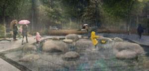 Lors de la présentation, disponible ici, les concepteurs ont présenté l’aménagement proposé dans lequel 50 % de la surface sera végétalisée et où plusieurs zones de rétention des eaux de pluie seront mises en place, dont un water square.