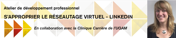 En collaboration avec la Clinique Carrière de l'UQAM, nous présentons la 1ère édition d'un atelier de développement professionnel s’adressant aux diplômés désirant acquérir des connaissances liées au réseautage virtuel à l’aide des réseaux sociaux et, plus spécifiquement, du réseau LinkedIn. À travers cette conférence, les participants pourront faire le point sur leurs besoins et se familiariser avec les principes du réseautage virtuel. Cet atelier se veut un espace de réflexion sur les tendances actuelles et sur la façon de construire et de maintenir un profil professionnel virtuel.