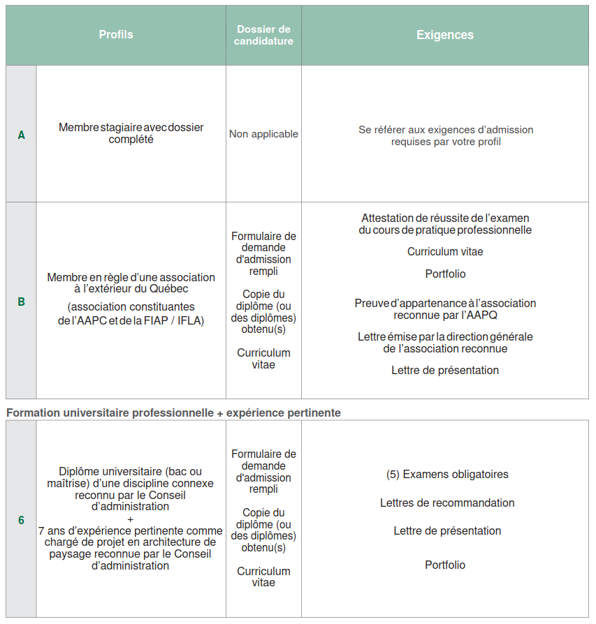 En 2012 et 2013, les membres de l’AAPQ ont statué en faveur de la révision des profils et des exigences d’admission, en mettant sur pied un nouveau Programme de stage en architecture de paysage (PSAP). Désormais, pour devenir membre agréé, tout membre devra réussir les 5 examens du Cours de Pratique professionnelle et remplir les exigences s’appliquant à son profil d’admission. Les notes de cours de pratique professionnelle disponibles se déclinent en 5 modules. En voici les thèmes :