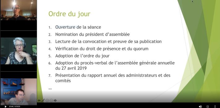 Rappelons que cette assemblée tenue en mode virtuel répond à l’orientation 4.3.3 de notre plan stratégique 2019-2024 qui vise à « Transformer la vie associative par l’intégration des nouvelles technologies telles que la webdiffusion ».