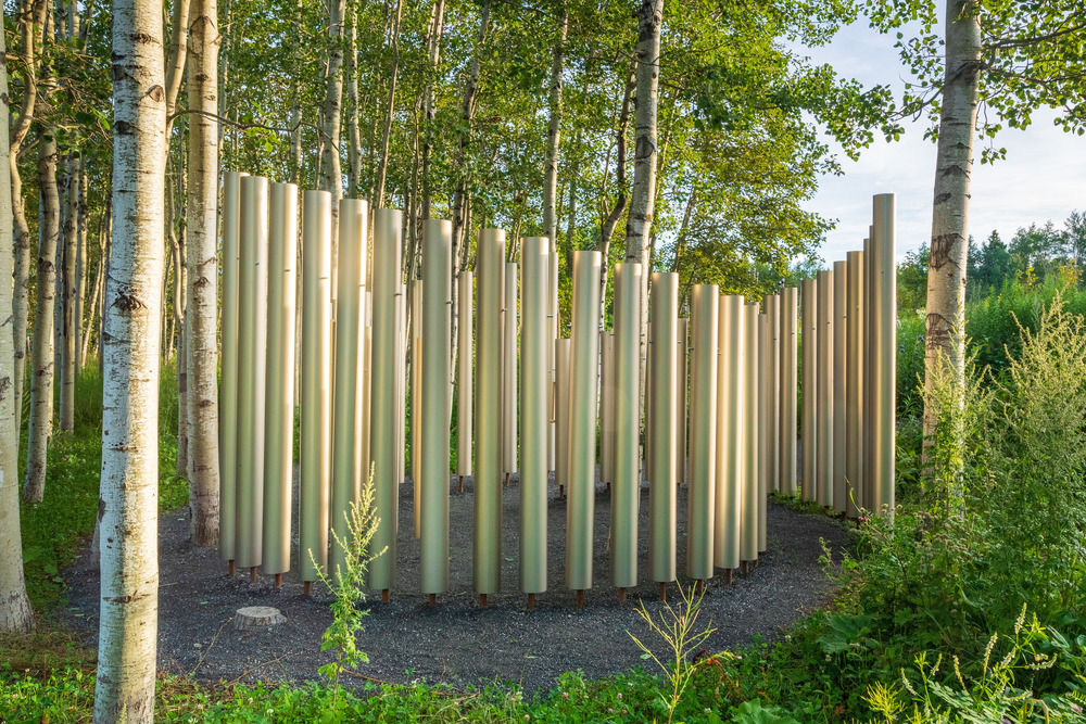 Cette folie musicale prend forme dans une clairière de la forêt. Les visiteurs se déplacent dans et autour de cet instrument géant, qui prend vie en vibrant aux sons de la forêt.