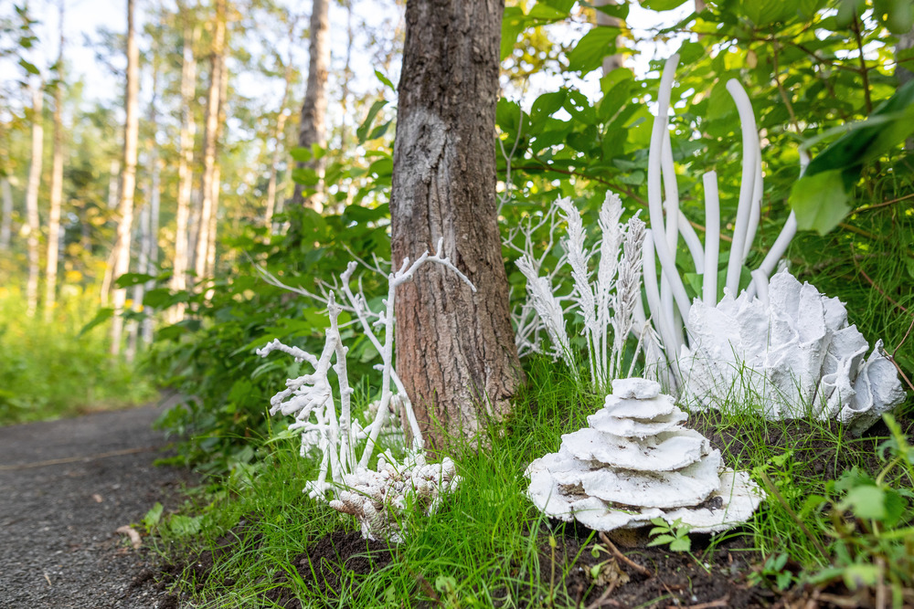 Une barrière de corail d’un autre genre prend forme le long d’un sentier. Une communauté de calcaire s’enracine dans le boisé avec un métissage de formes qui crée un paysage insolite et une nouvelle communauté hybride.