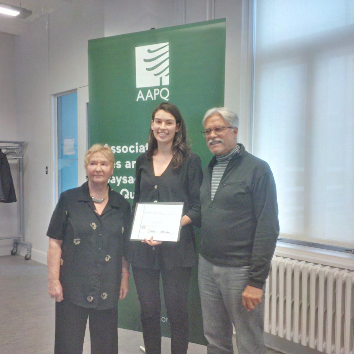 Danièle Routaboule, membre honoraire de l'AAPQ, a également fièrement remis la toute première Bourse de voyage - Danièle Routaboule à Amélie Fortin. Cette bourse est remise à une étudiante en architecture de paysage désireuse de faire un voyage à l'étranger.